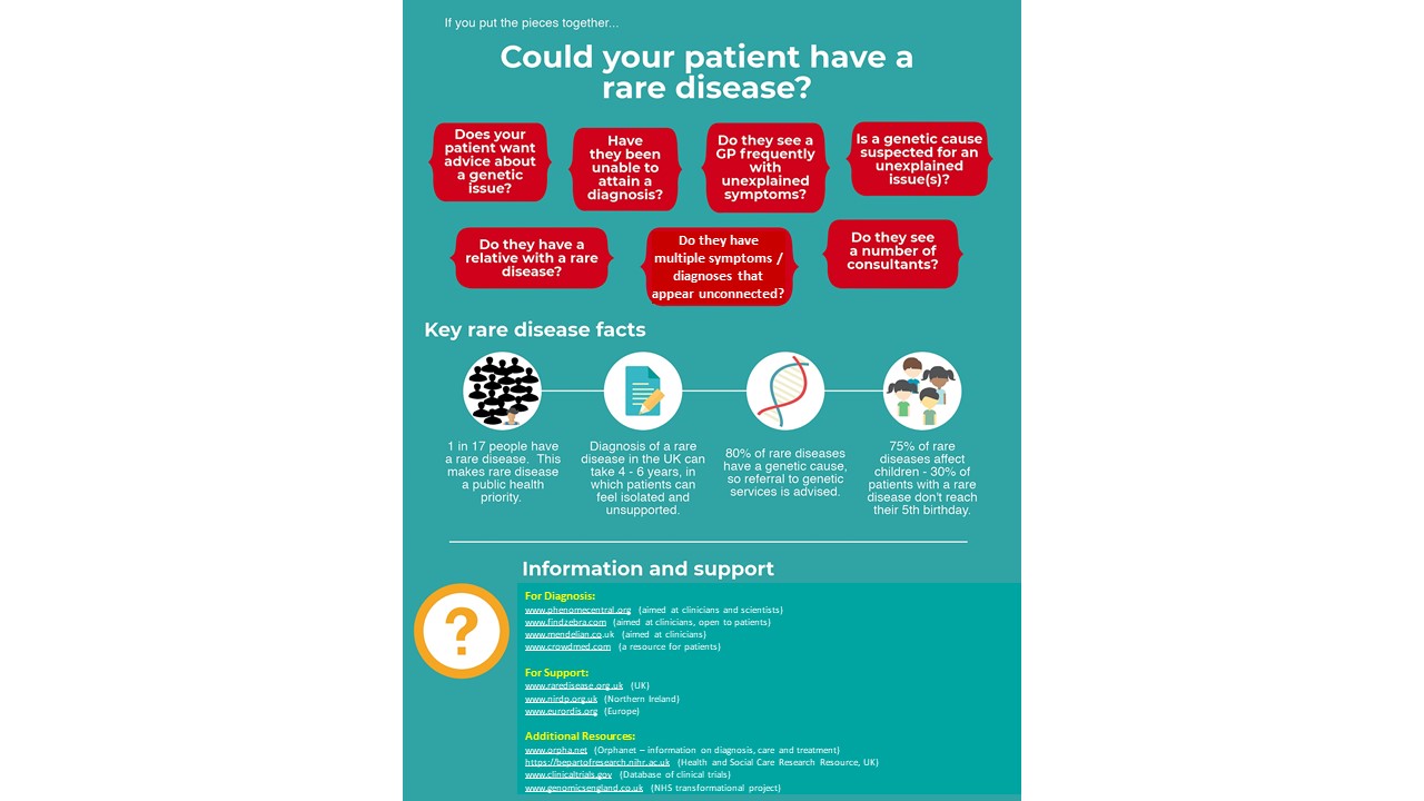 A rare disease often has complicated, severe medical needs. GPs have considerable expertise managing long-term complex diseases, but few have resources to research the > 8,000 rare diseases that are recorded.