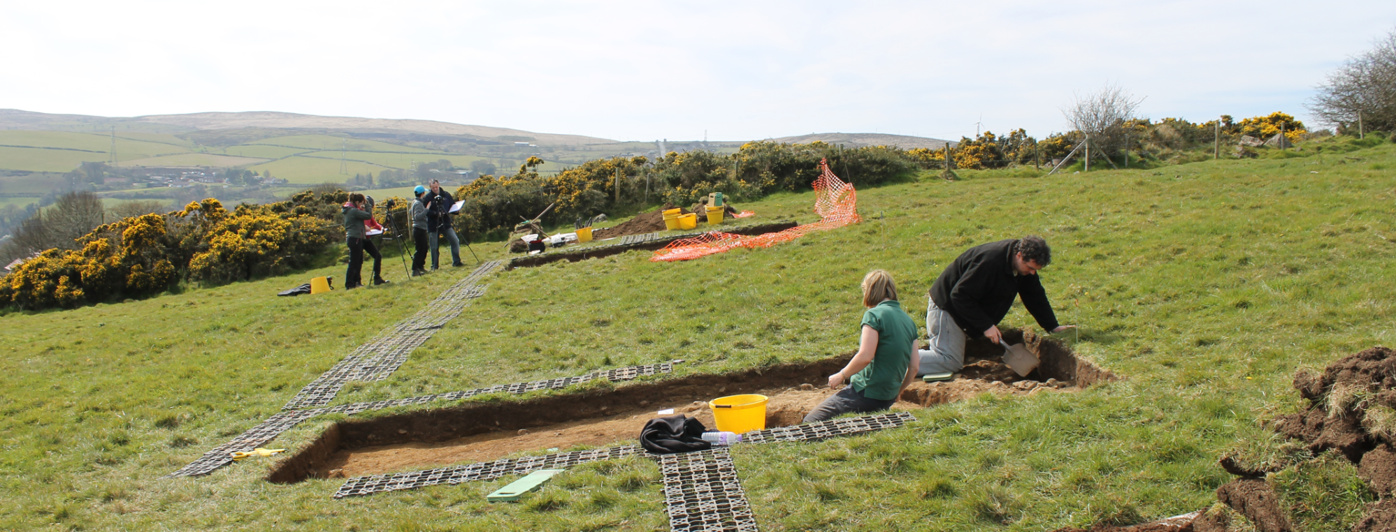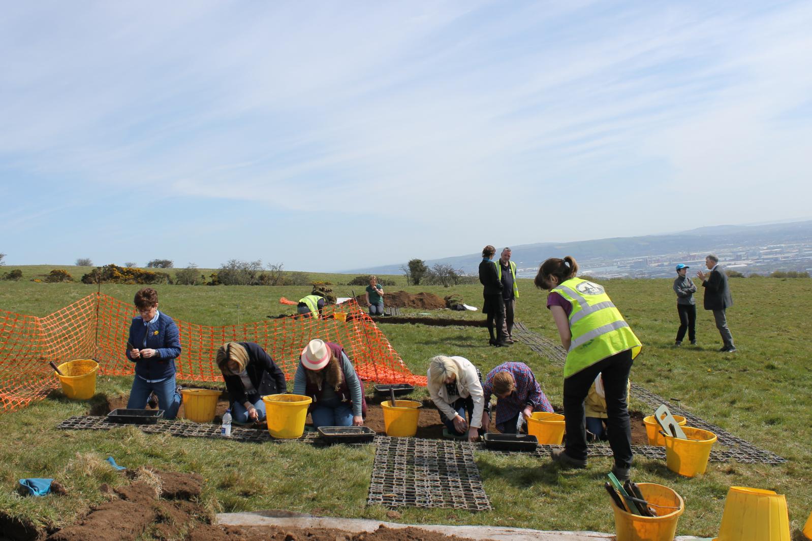 In April 2016 the Centre for Archaeological Fieldwork (CAF)was commissioned by Cultúrlann McAdam Ó Fiach and the Spectrum Centre to devise and lead a two-week community-based archaeological fieldwork programme on their behalf as part of the Farset Heritage Project, funded by the Heritage Lottery Fund. The site selected for the investigation was on the south-facing slope of Squire’s Hill on the outskirts of Belfast, in the townland of Ballysillan Upper and in the parish of Shankill. The dig was directed by Ruairí Ó Baoill and took place between 18th and 29th April 2016.