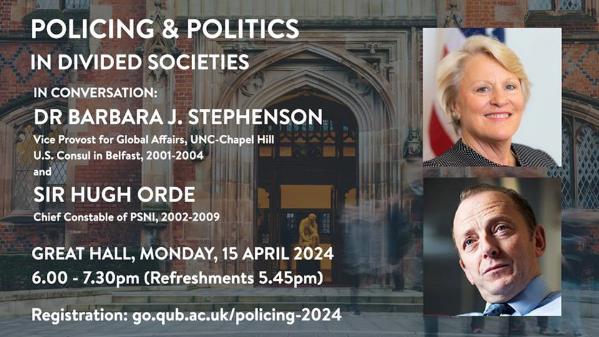Held on 15 April 2024, this ‘In-Conversation’ event featured Dr Barbara J. Stephenson, Vice Provost for Global Affairs, UNC-Chapel Hill, and former U.S. Consul in Belfast (2001-2004) and Sir Hugh Orde, former Chief Constable of the PSNI (2002-2009).