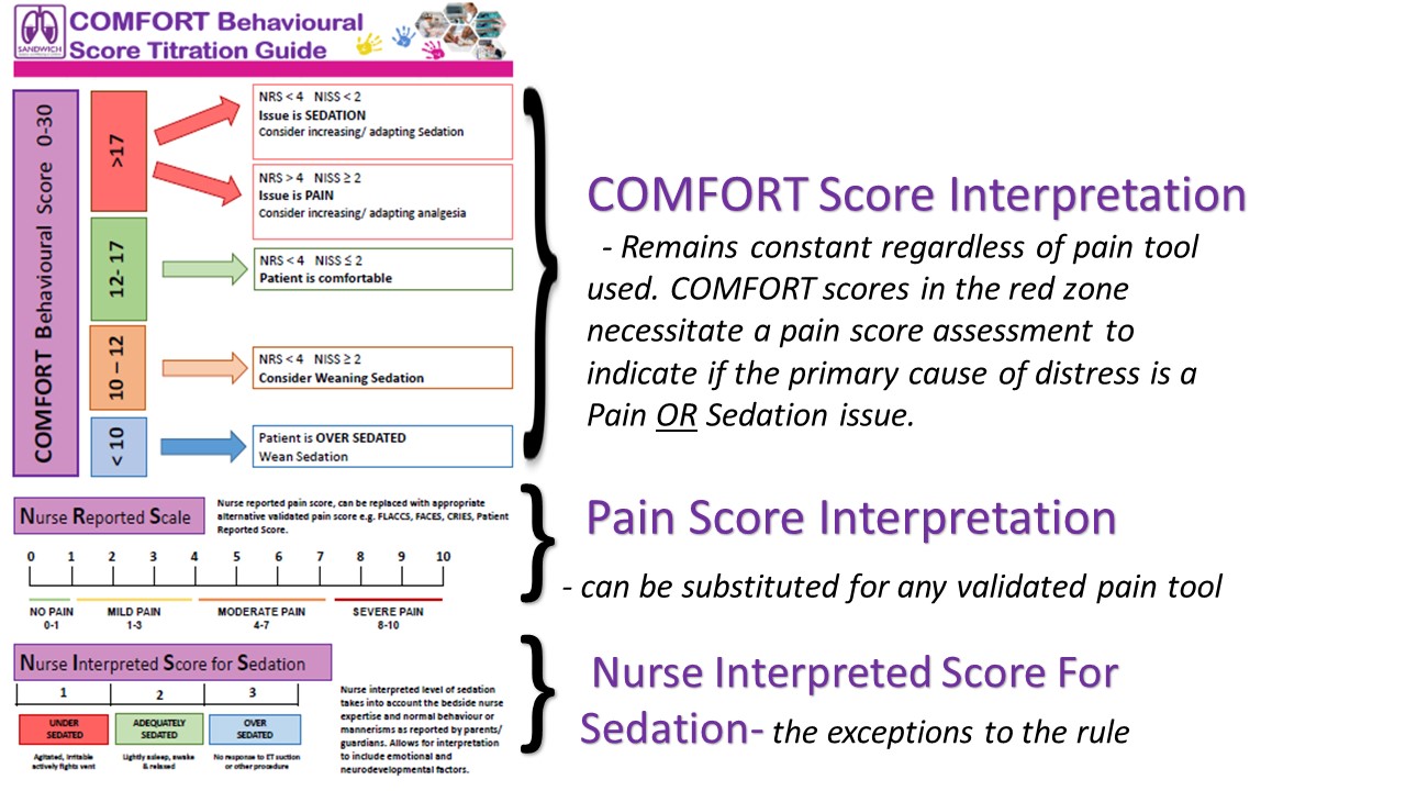 In each version of the titration guide the COMFORT Score colour coded zones remain constant. The changable section is the pain assessment tool used to indicate if a high COMFORT Score relates to a pain or sedation issue.