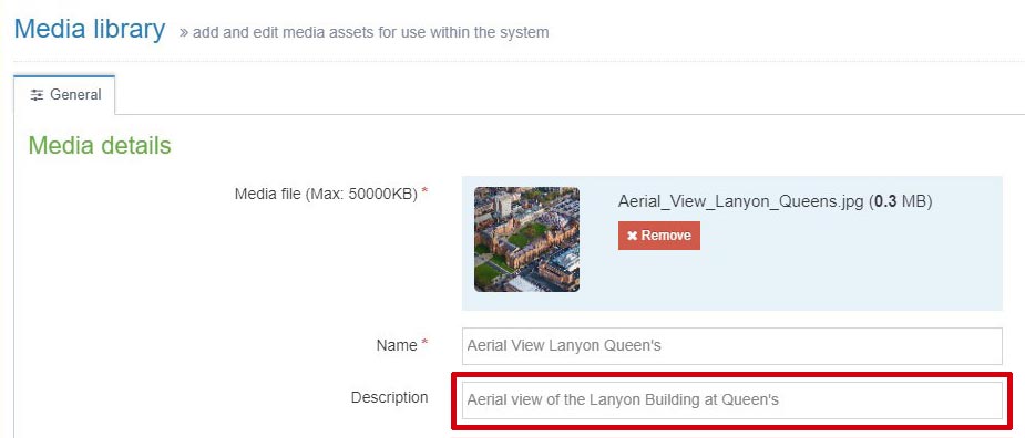 CMS content creators and editors: When adding media to the Media Library in the CMS, if an image will be used as informative, then please add the appropriate text alternative in the 'Description' field of the Media Details.